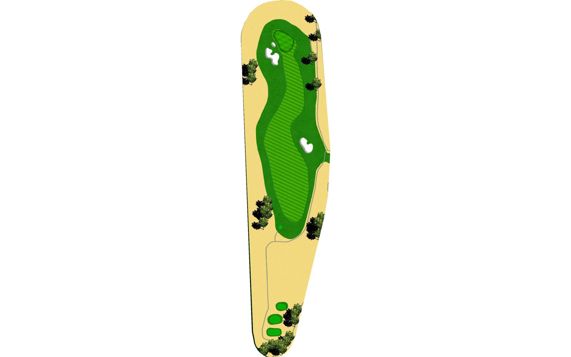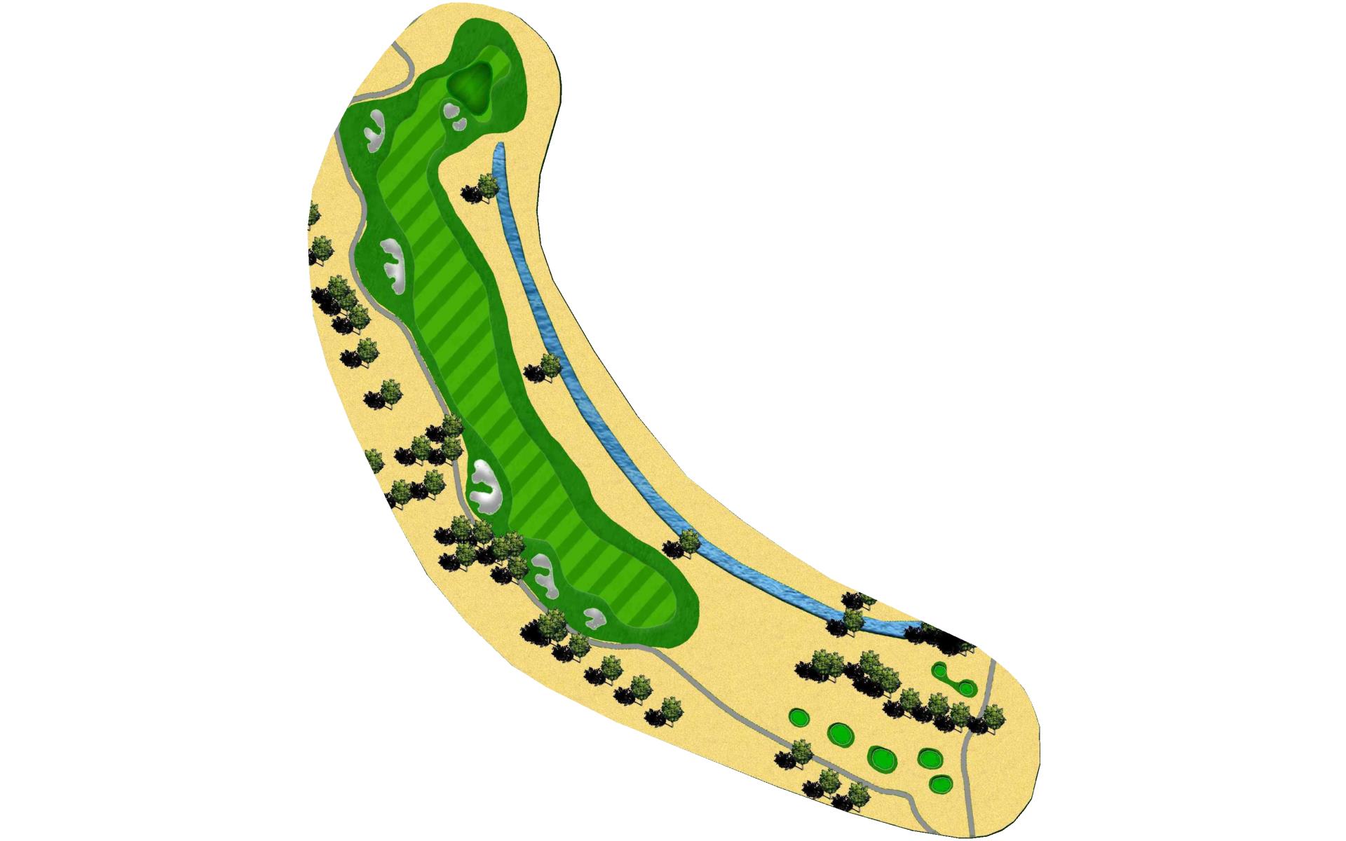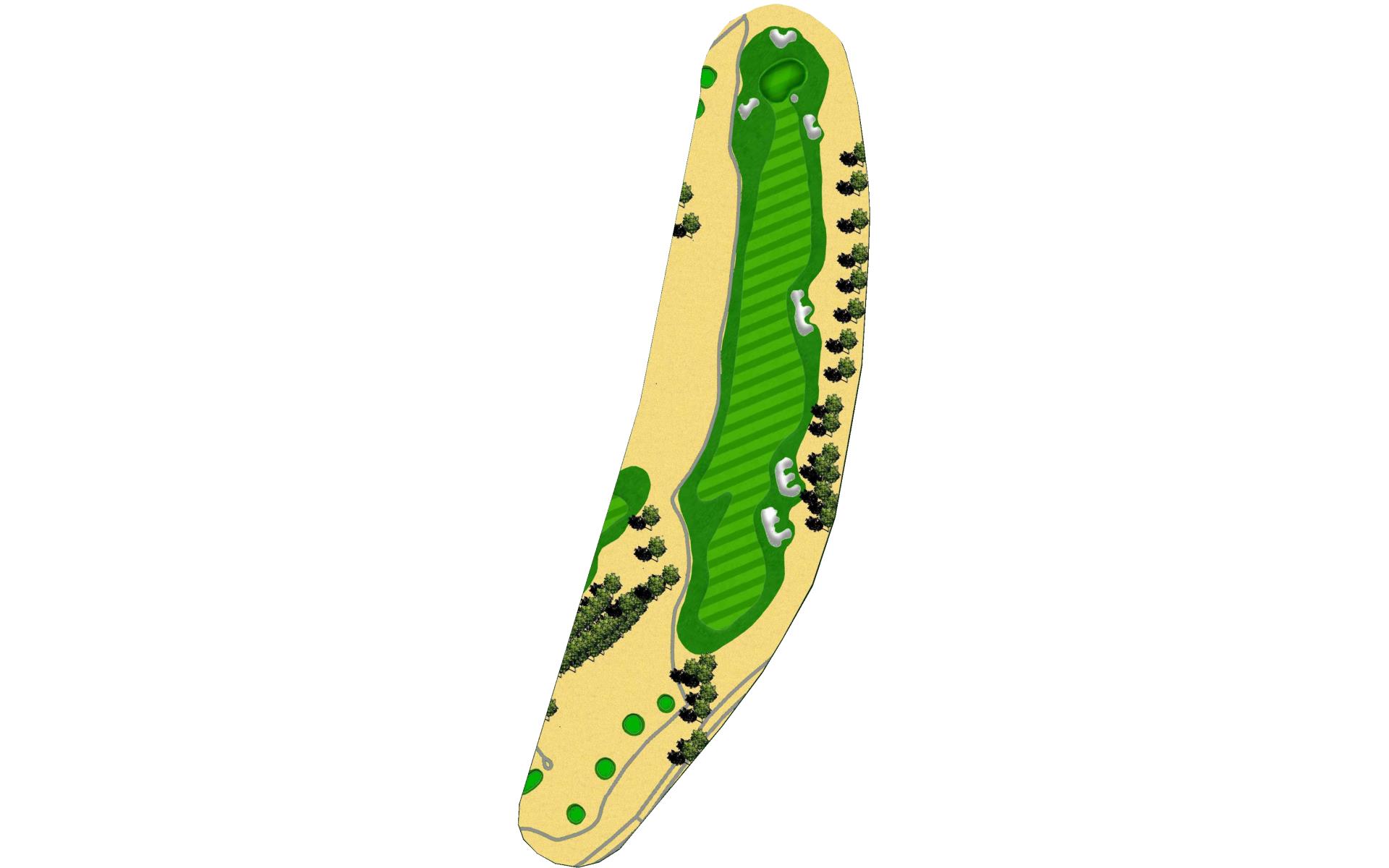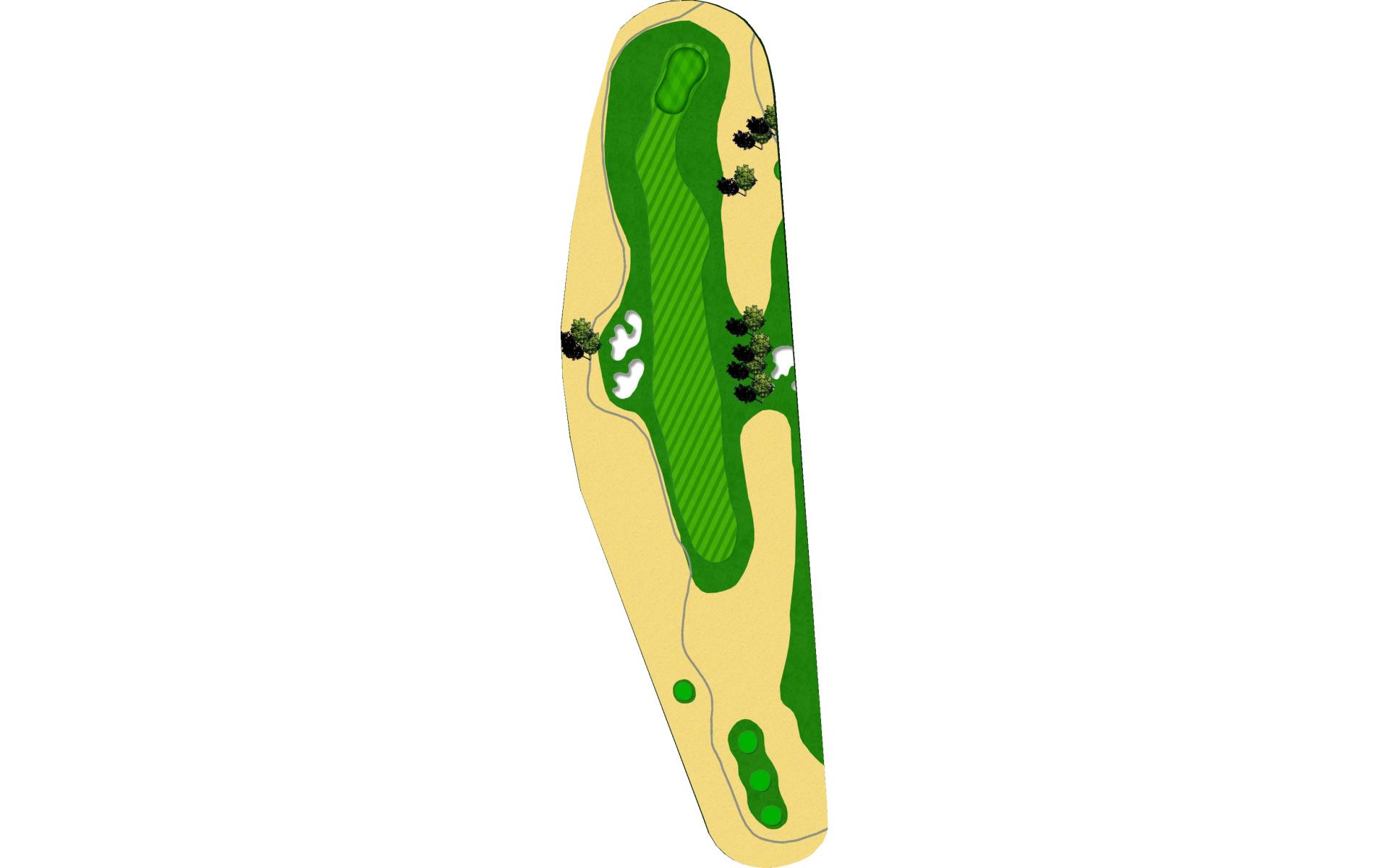 A tee shot down the right is the best play off this severe dogleg left par 4. A deep grass bunker awaits shots that try to cut the corner. An accurate iron shot is required to hit this back-to-front sloping green.
