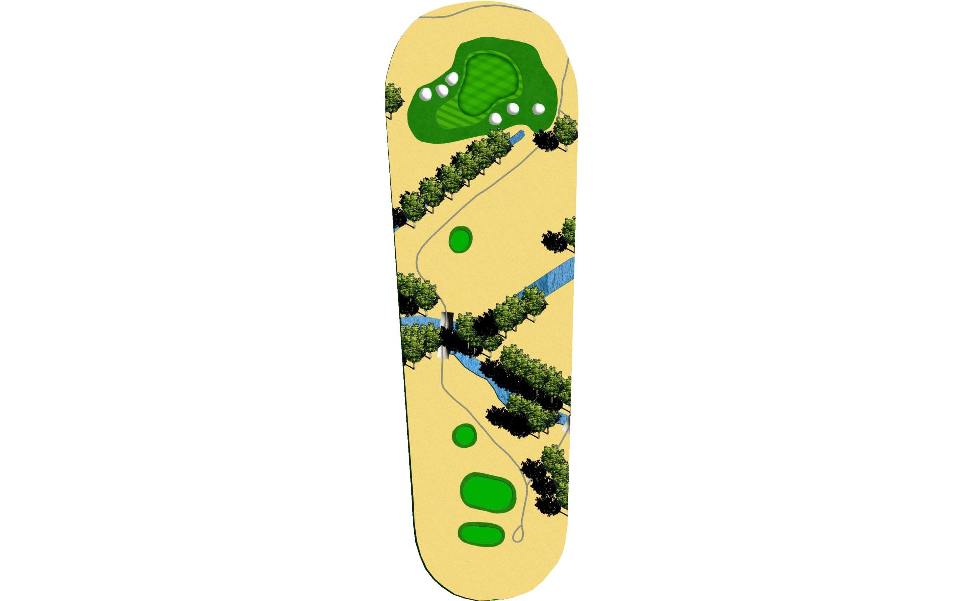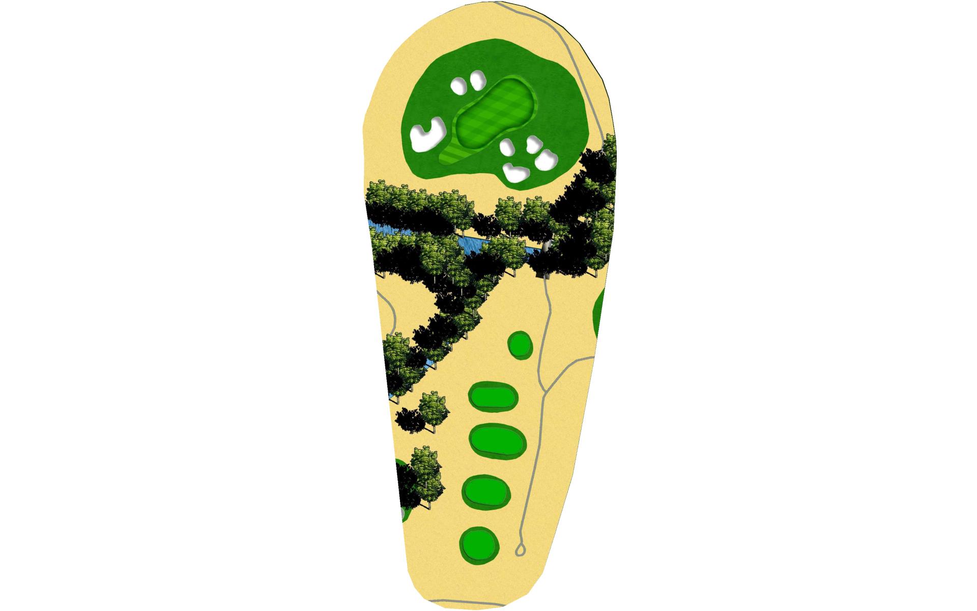 The twelfth features a split fairway and requires an accurate tee shot. Favoring the right is the safe play, but longer hitters can try the left. On the approach, most players will want to take an extra club to hit this elevated, two-tiered green.