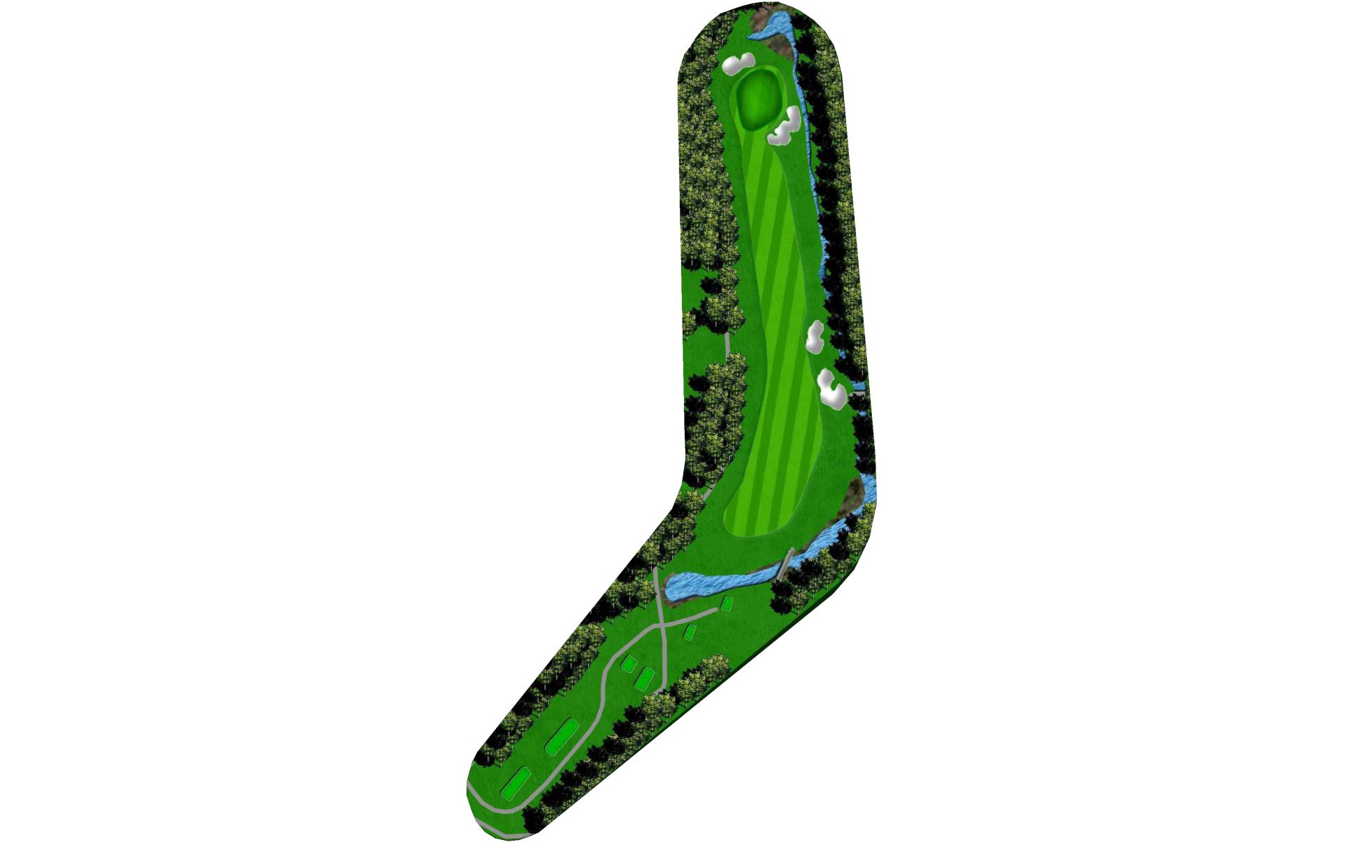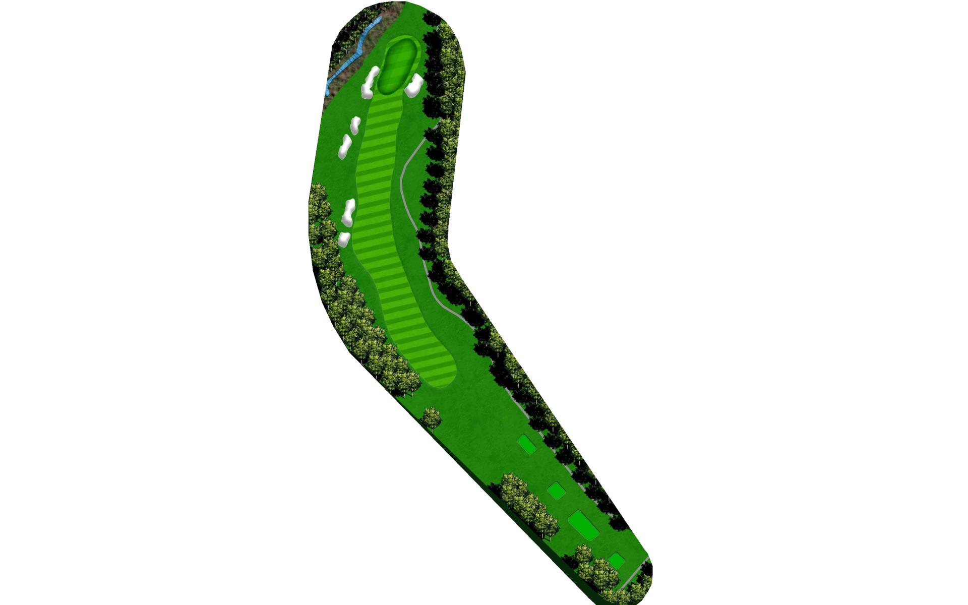 If you cut off enough with your driver, you may have a mid-iron shot into green; otherwise, you'll have to lay up short of creek in front off the green and play a three-shot hole.