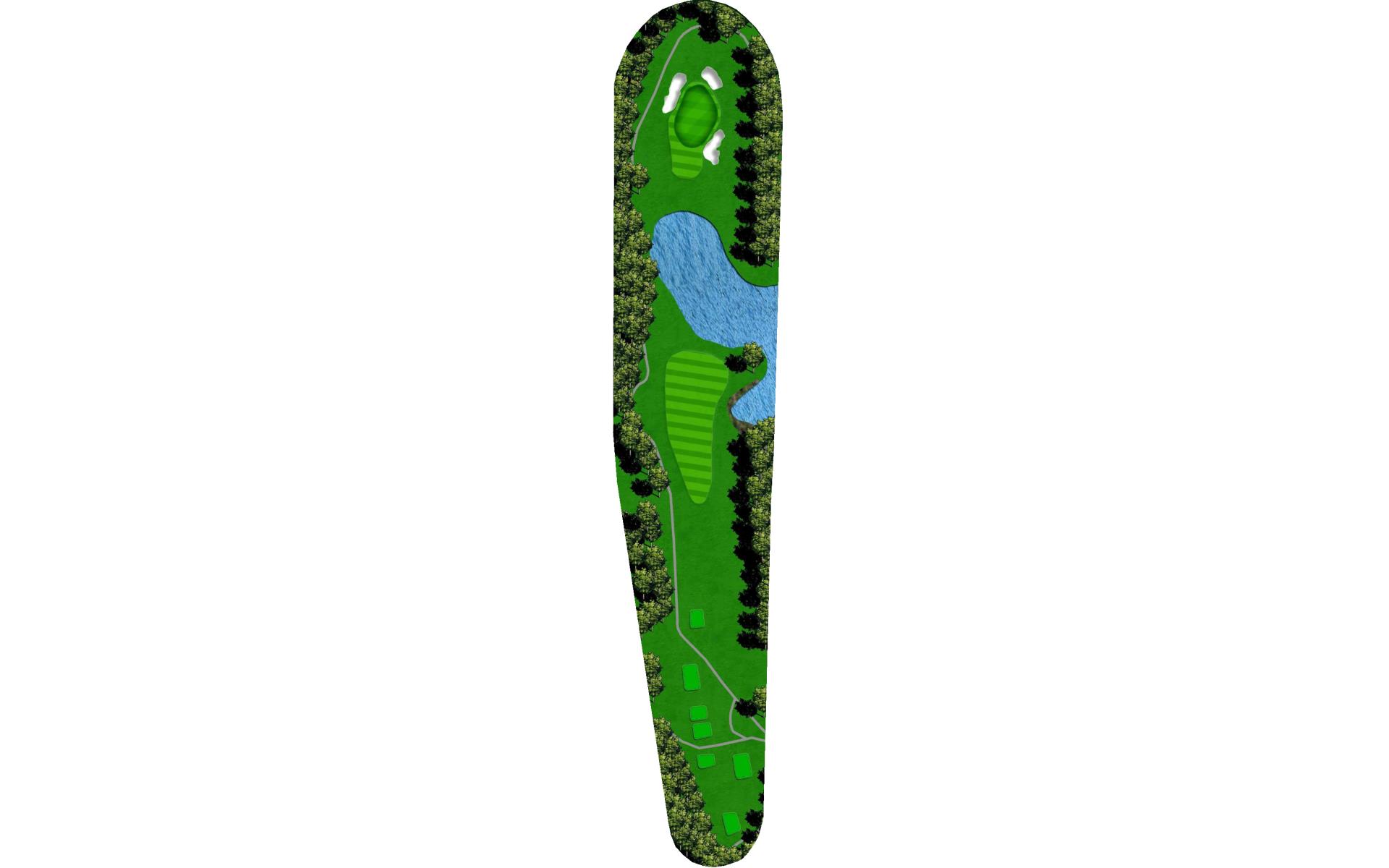 Your second shot can be tough depending on the final resting place from your drive. It can be a blind and long approach with your second shot, but stay left since a hazard runs right.