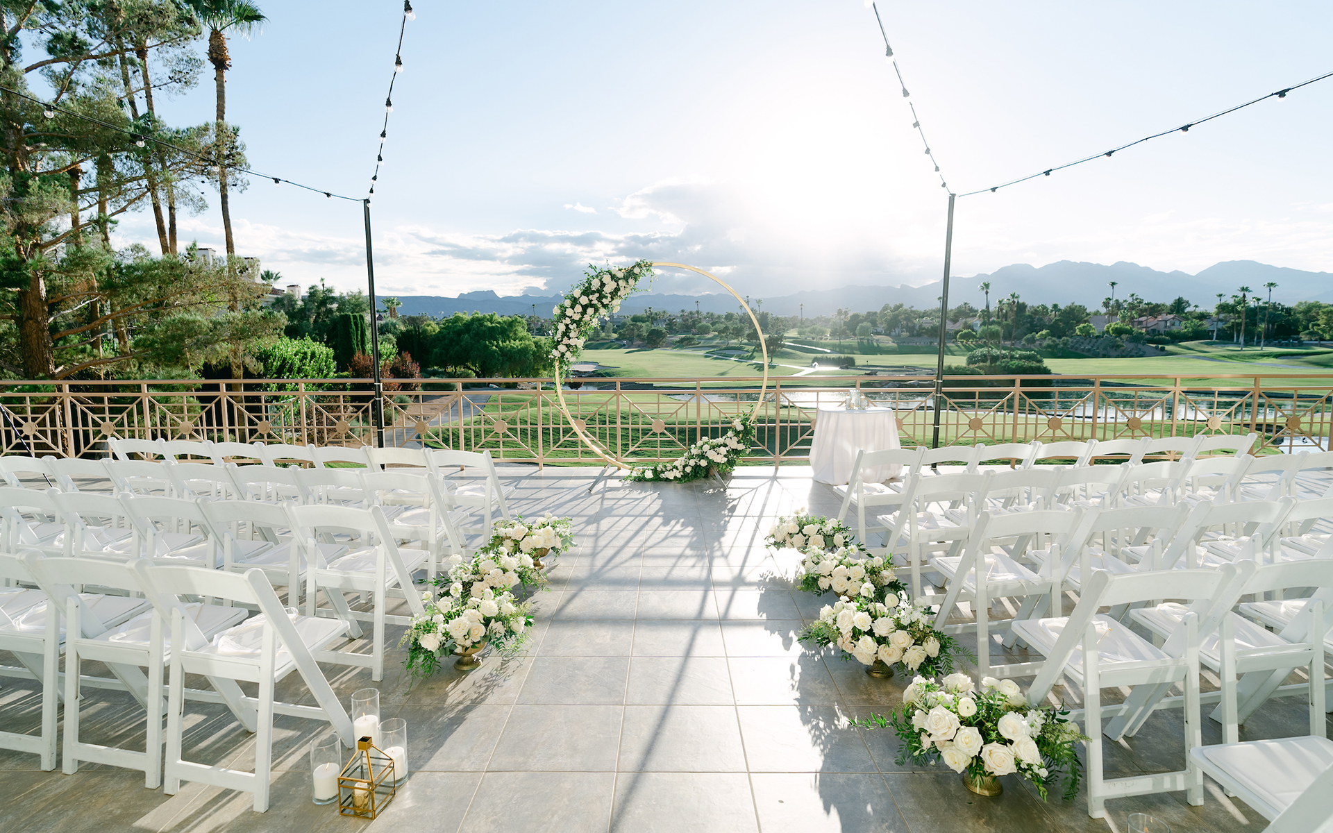 Have your wedding ceremony and reception in a private country club setting. The Canyon Gate Ballroom is enclosed with 25-foot glass windows and an expansive balcony overlooking the beautifully manicured golf course and Red Rock Mountains. Canyon Gate is among the most ideal and picturesque Las Vegas wedding places. Watch the sunset as you wine and dine with your closest family and friends, then party the night away.