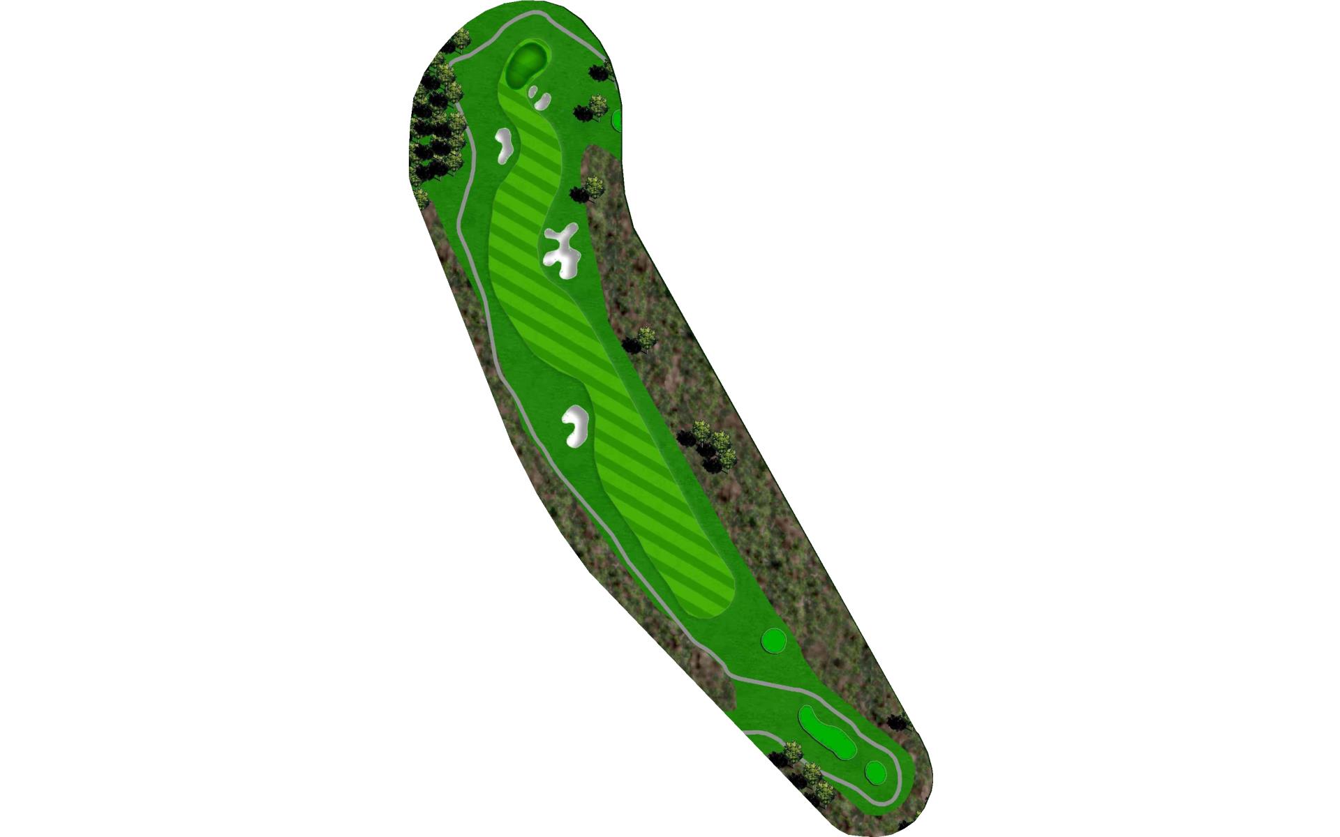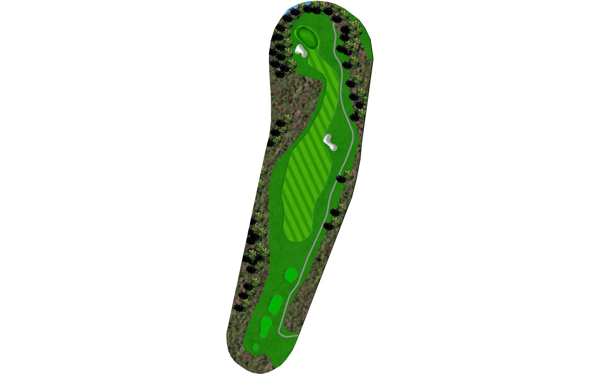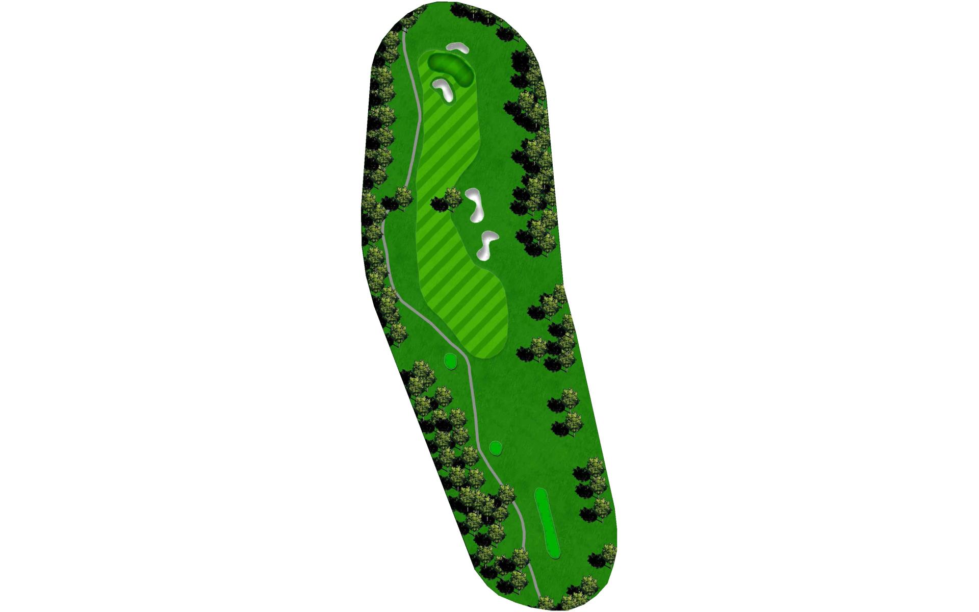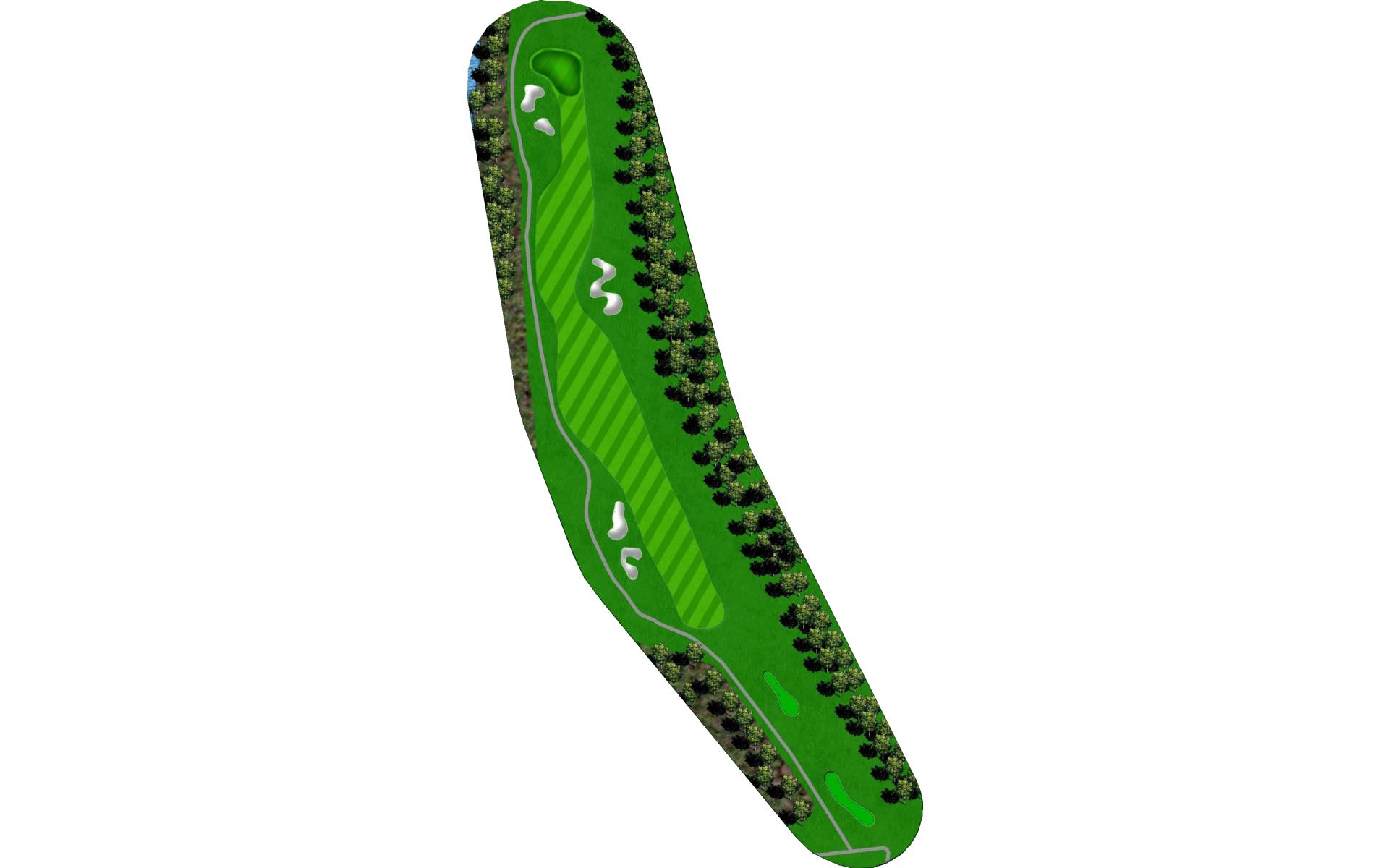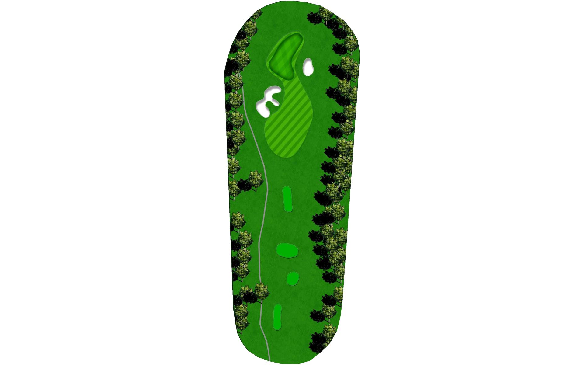 A penalty area left and bunker right guard the green on the picturesque par 3. On the putting surface, a large slope in the middle will challenge even the best putters.