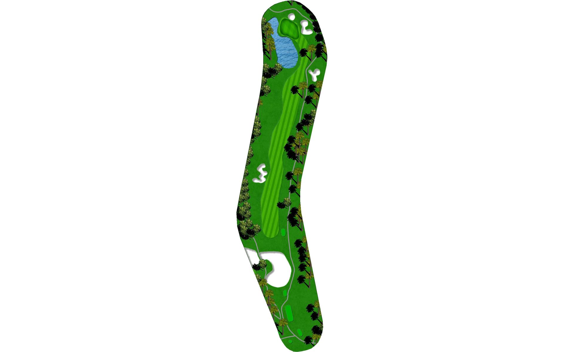 This severe dogleg left can be shortened if you dare to hit a driver over the towering palms on the left. If not, a 3 wood with a slight draw will leave you with a mid- to long iron into this back-to-front sloping green. Below the hole is a must.