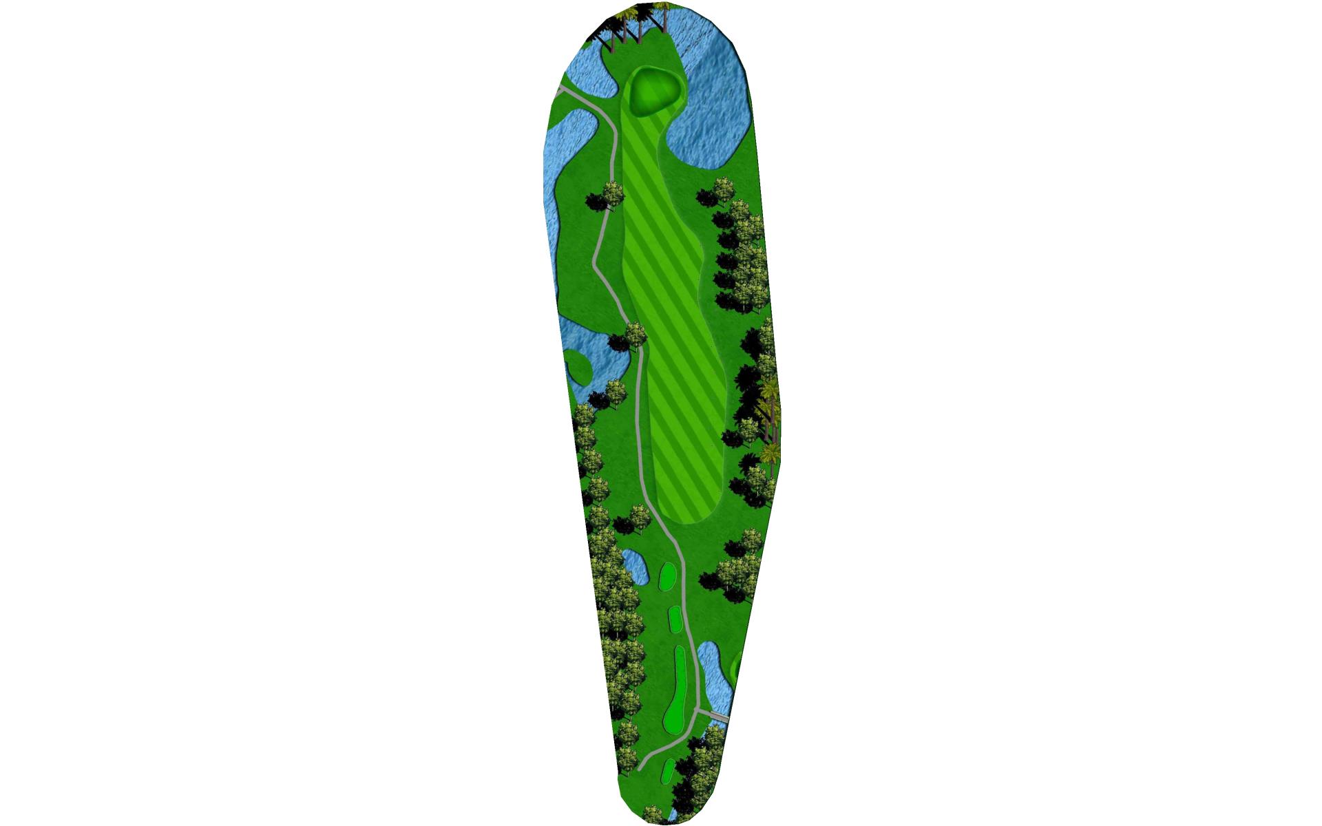 Three shots are better than two here. The first landing area is guarded by a long fairway bunker on the left. A short iron or wedge right center on your second shot will leave you in the best position for a perfect approach over the water and onto this massive green.