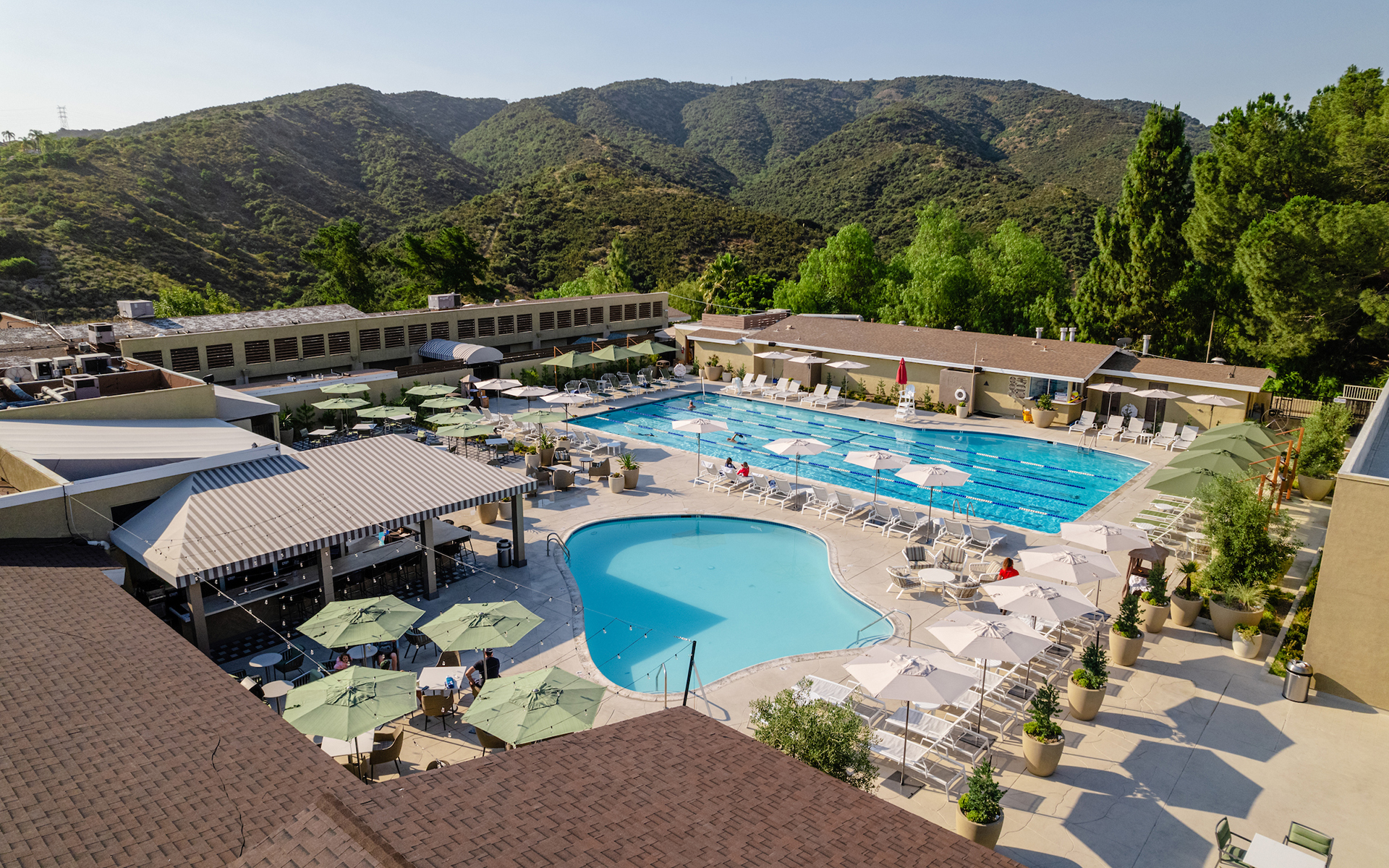 Discover the newly transformed pool area, featuring the chic Dive Bar with stylish awnings, sleek countertops, and state-of-the-art TVs, serving up delectable bites and craft cocktails. Lounge in ultimate comfort on our new pool loungers and soft seating areas, surrounded by enhanced landscaping that provides both beauty and thoughtful privacy.