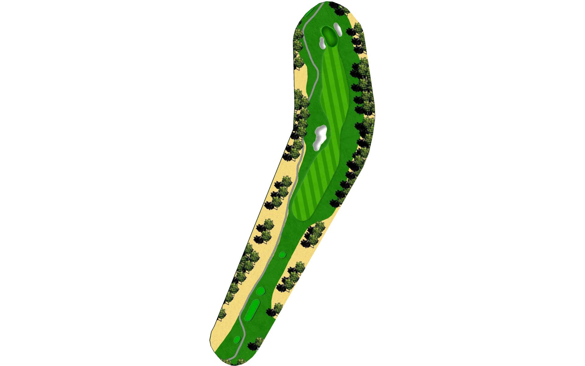 A slight dogleg right forces you to either try for distance plus accuracy to get very close to this green, or lay back to a more open area short of the grove of trees which will allow a full shot with a short iron to the steep green. Beware the out-of-bounds left and right.