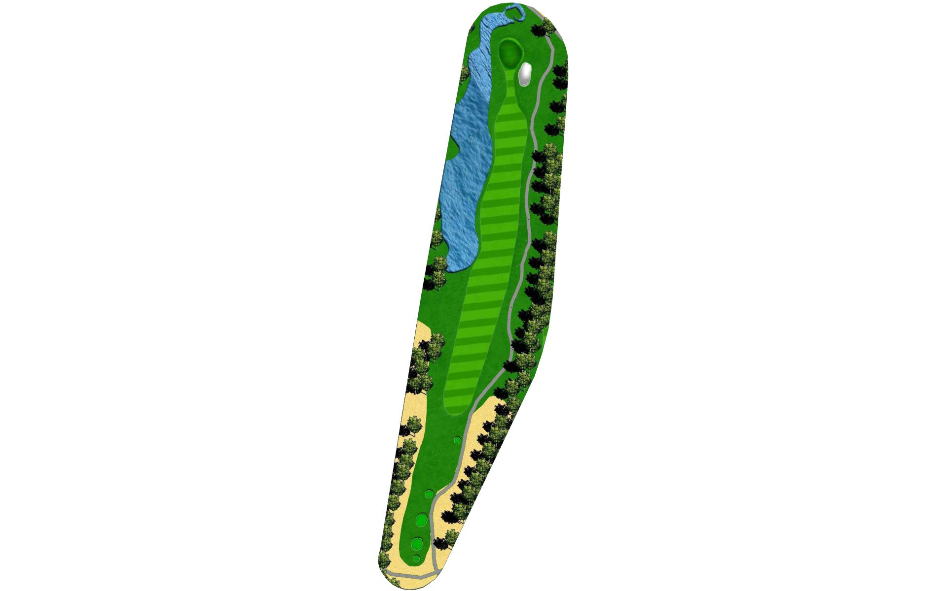 Our signature hole. A 1 ½-acre lake guards the left side of the fairway starting about 225 yards off the tee. The lake continues up the left side and closely guards the green. Favoring the right side may find you in the bunker facing the lake.