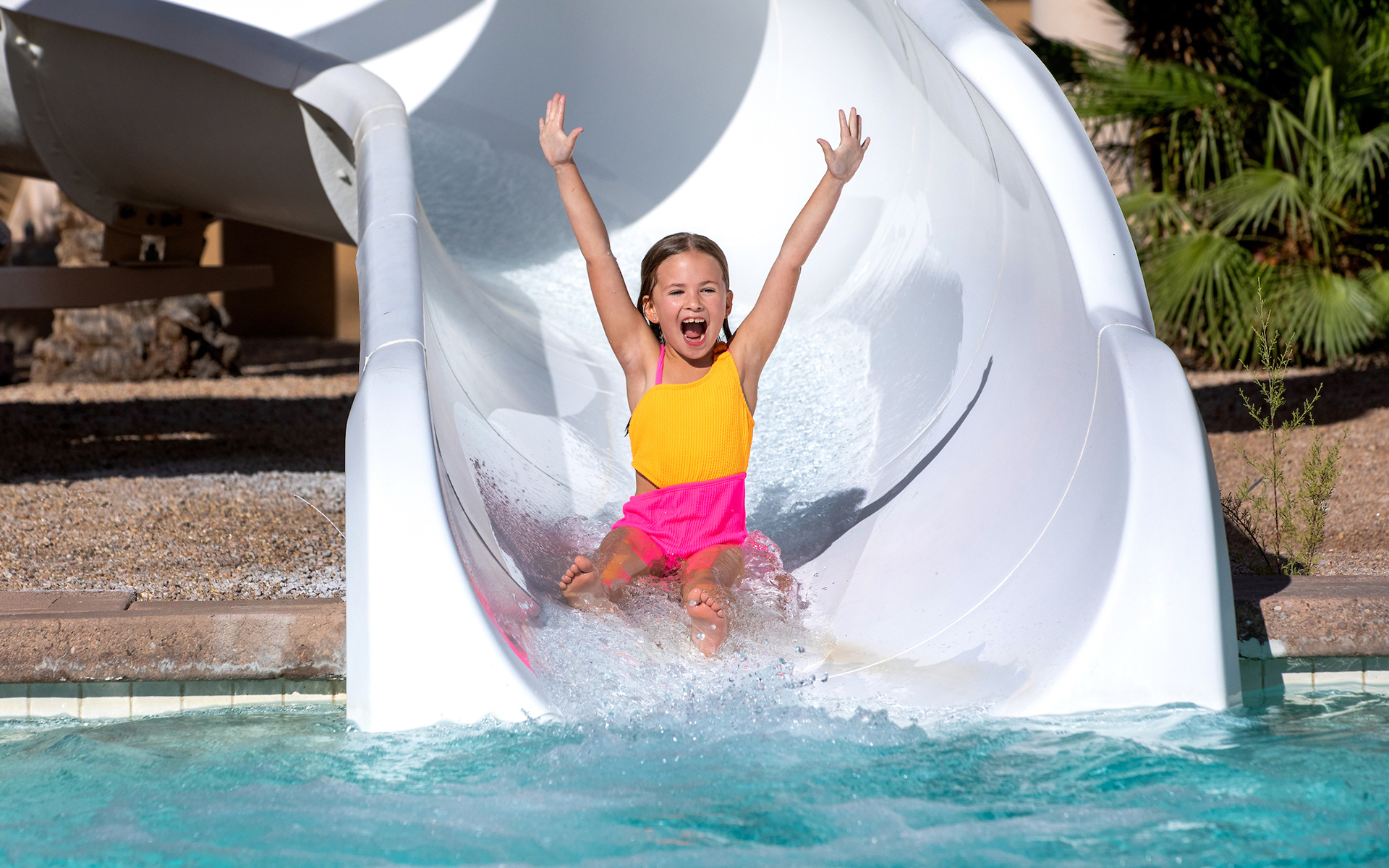 With 400,000 gallons of water in a six-lane, negative-edge lap pool; a fitness and gaming pool (with two four-story sidewinder waterslides); and a beach-entry, family-friendly lagoon, your family has plenty of opportunities for cooling off or working out.