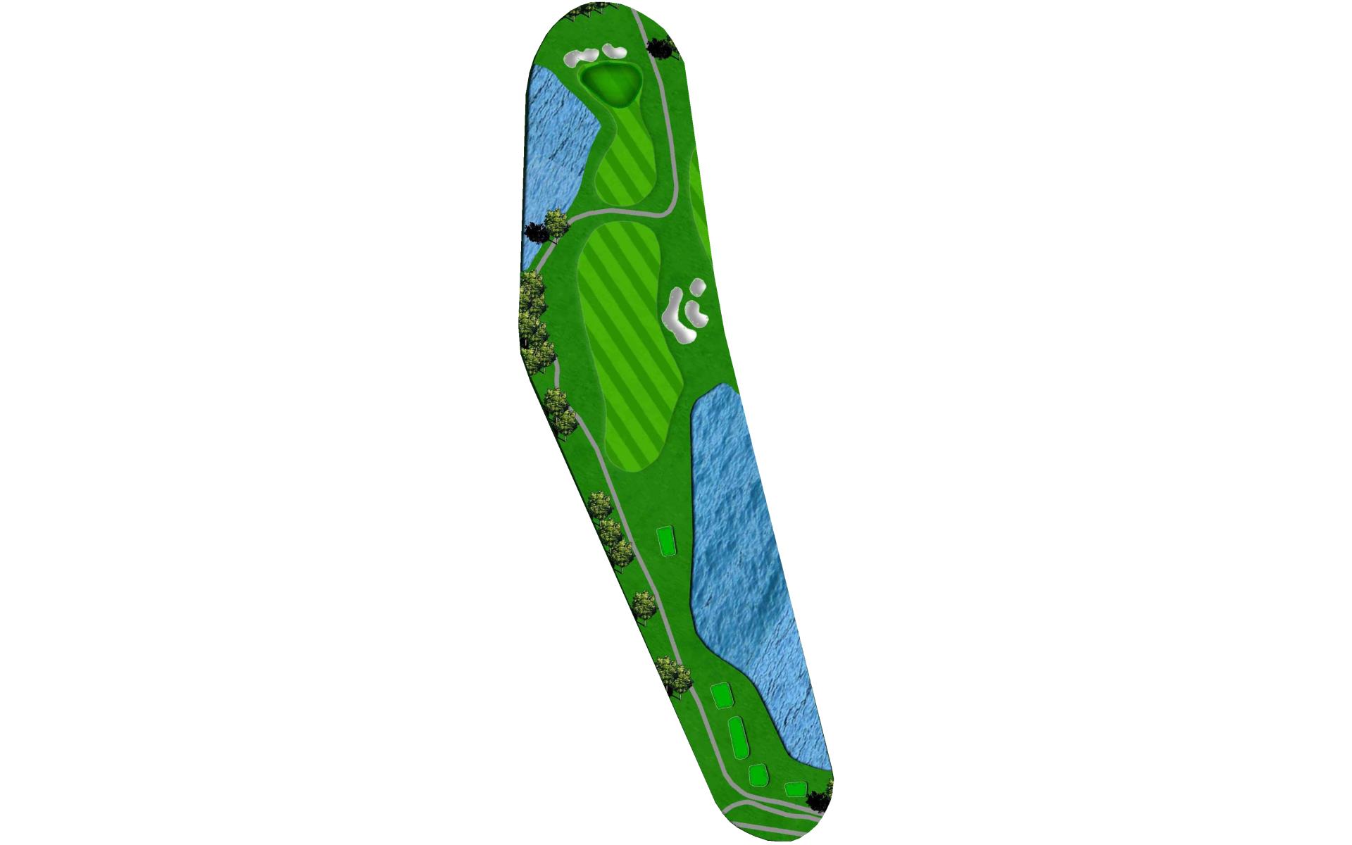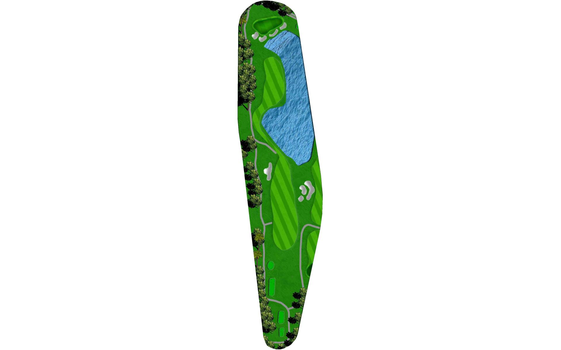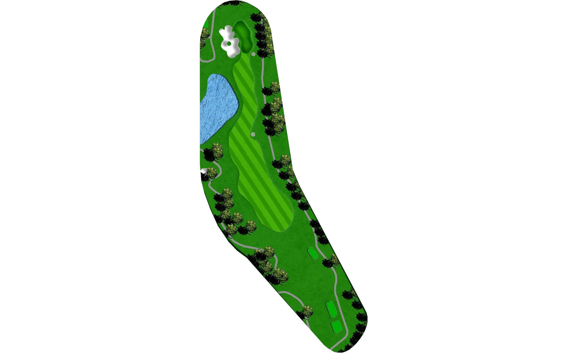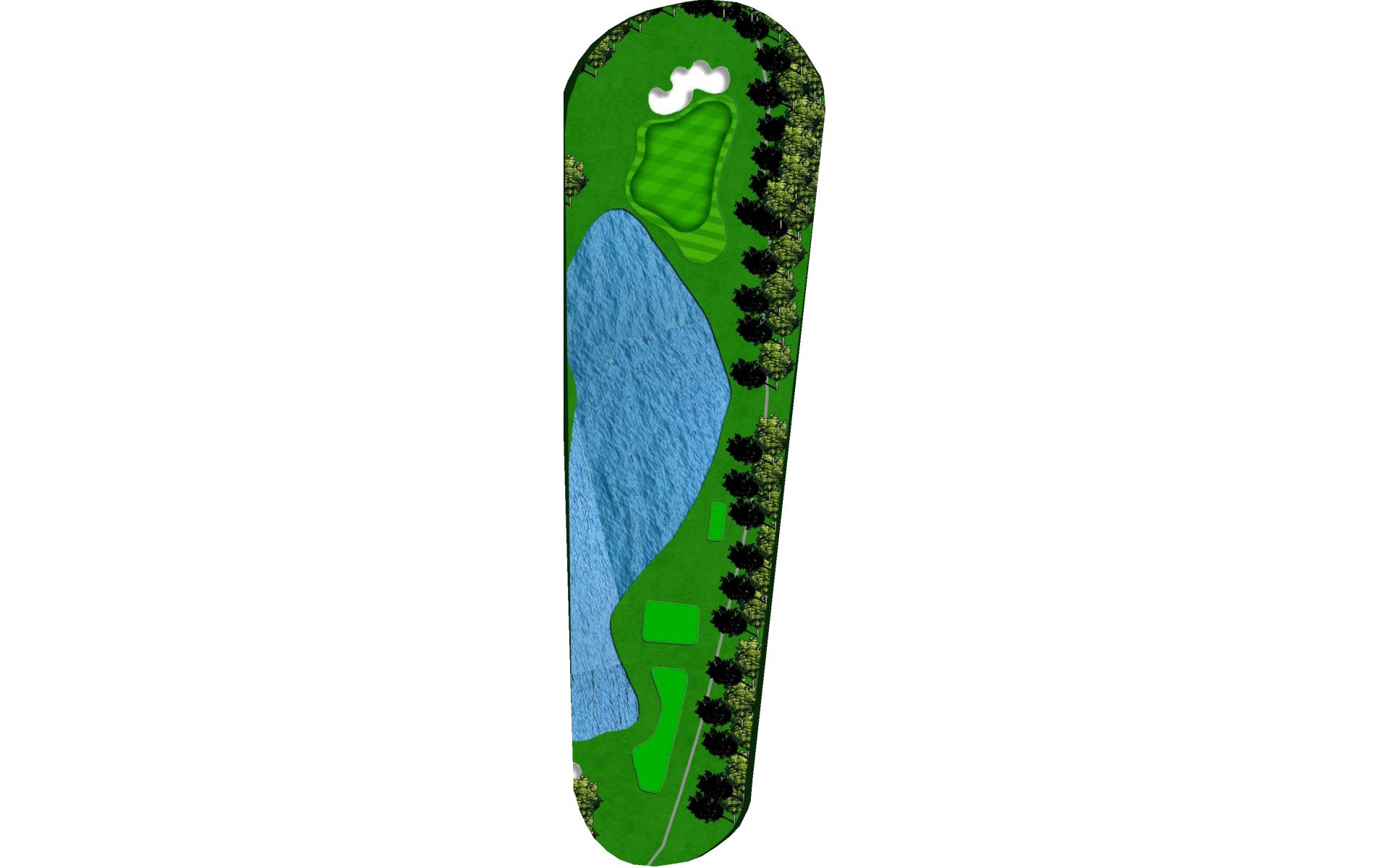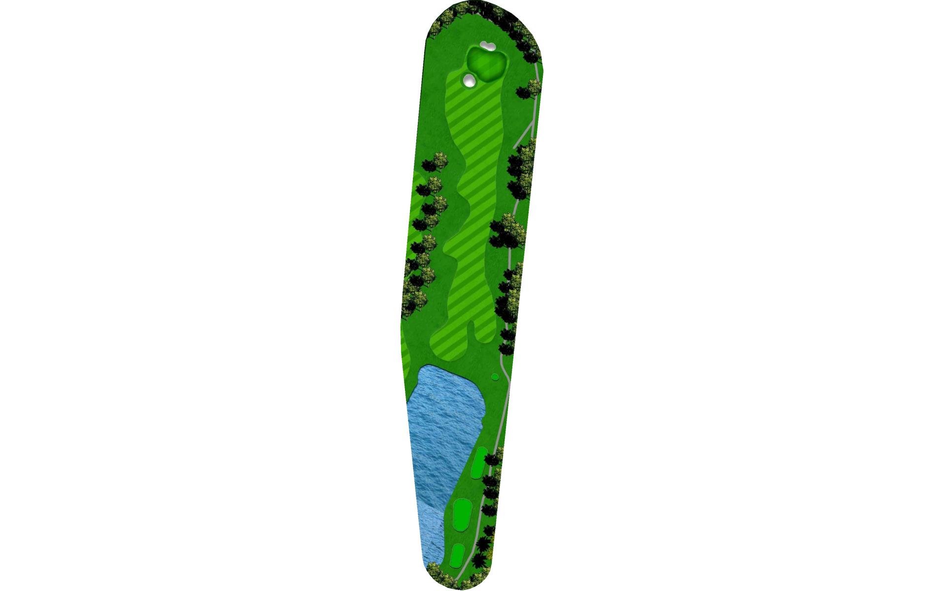 | "Bagpipes" is a long par 4 that sets up for a challenging finish. A good drive leaves a long approach into yet another peninsula green. Extreme undulation in the middle parts of the green make placement on the second shot paramount to success with the putter. |