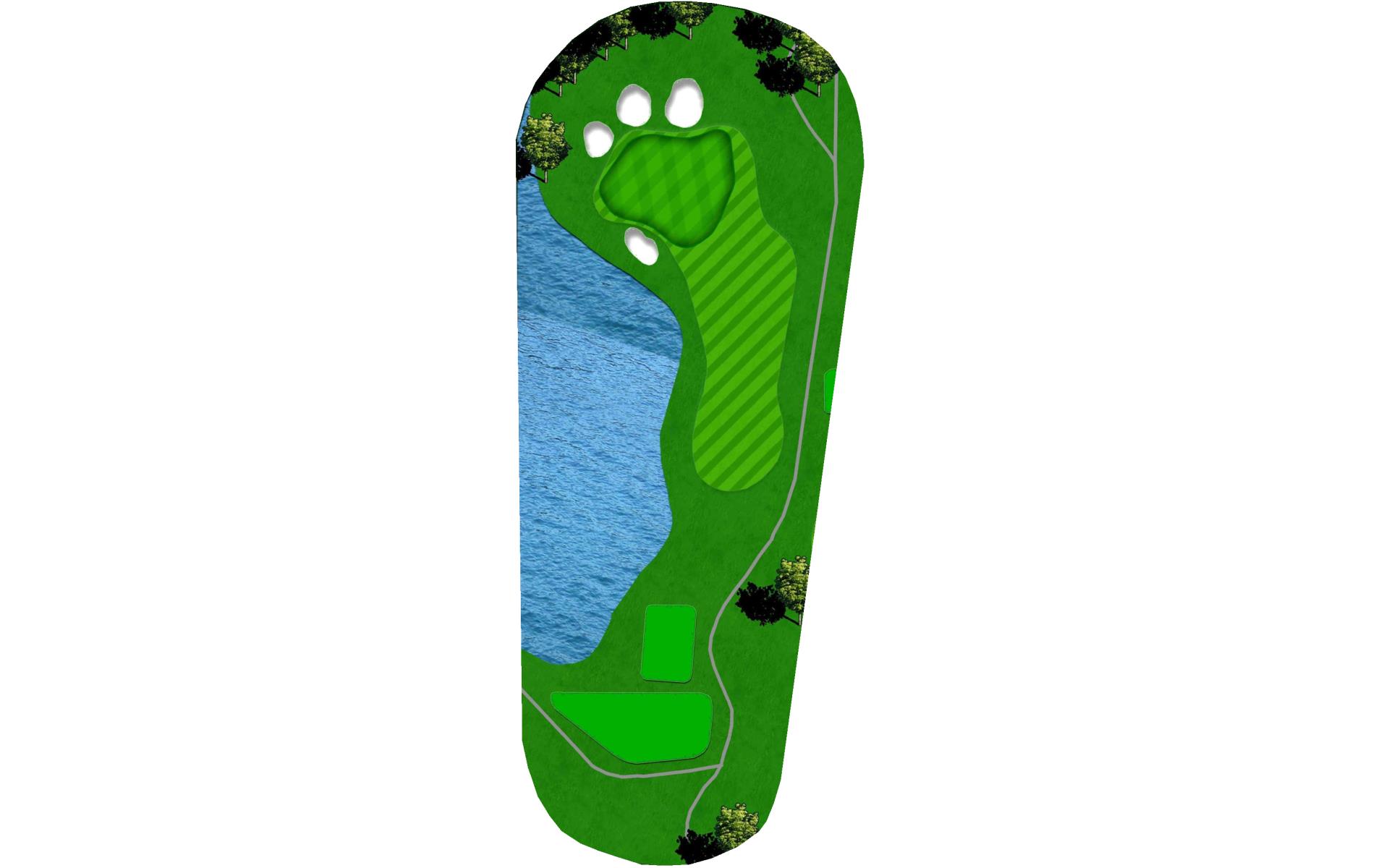 | "Eagle's Dare" is the only par 5 that does not force players to layup off the tee and is the longest hole on the golf course. Water surrounds this elevated two-tiered green on 3 sides, out-of-bounds runs down the other, and a large greenside bunker sits just short and to the right. Players should think carefully before taking it on. |