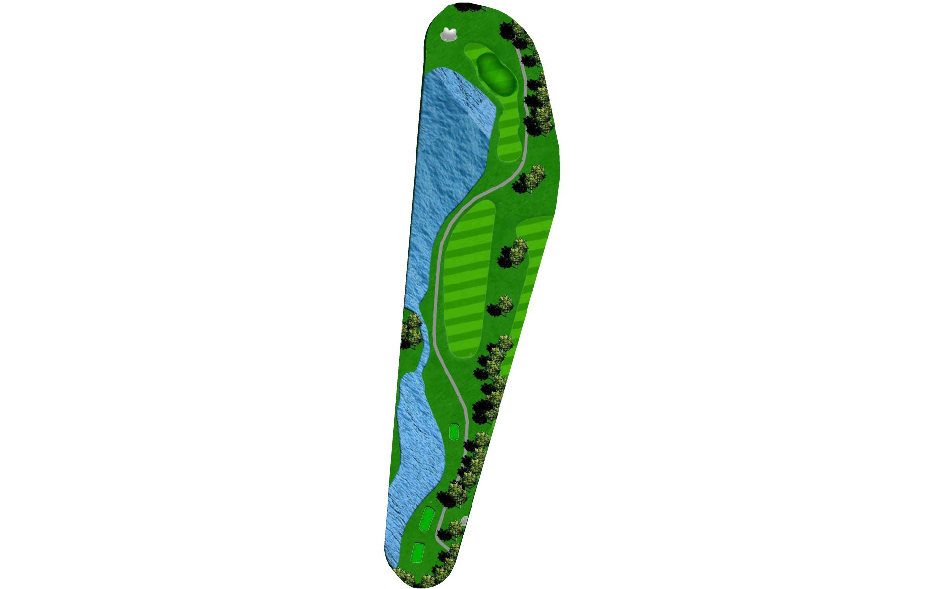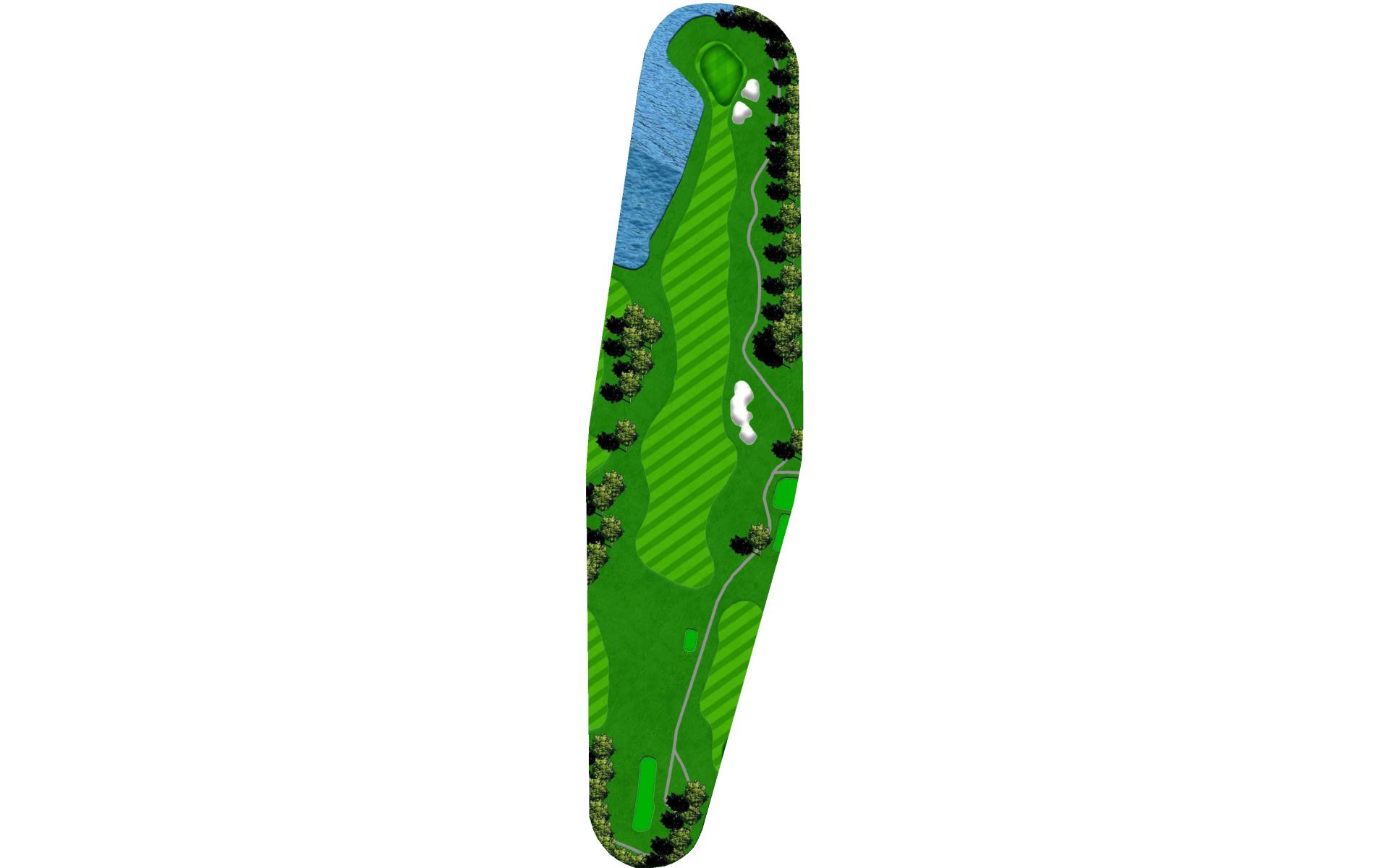 | The final par 5 on the course, "Temptation", is the most reachable. Water divides the fairway in half and some players need less than driver off the tee. Out-of-bounds running down the right side is certainty in play and greenside bunkers short of the green stop balls from rolling up if going for it in 2. |