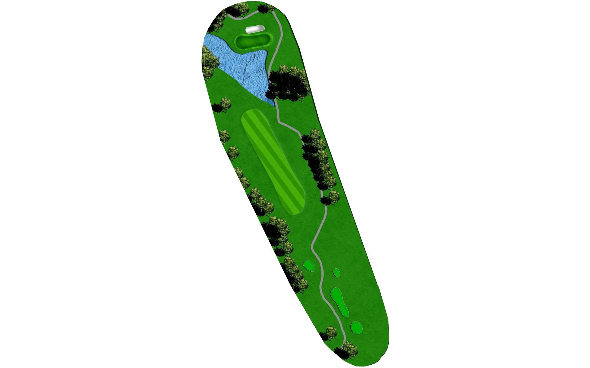 Average length par 5 with a massive fairway. You can hit down the right side or the left side from the tee. Aggressive players will favor the left side in order to have a shorter 2nd shot into the green possibly. If you’re playing this hole as a three-shot par 5, then you should favor the right side and stay away from the pond on the left. Distance control is key on your 3rd shot. Anything short of the middle of the green may feed down toward the water greenside. Long is an acceptable miss, but your nerve will be tested as you pitch back toward the water.