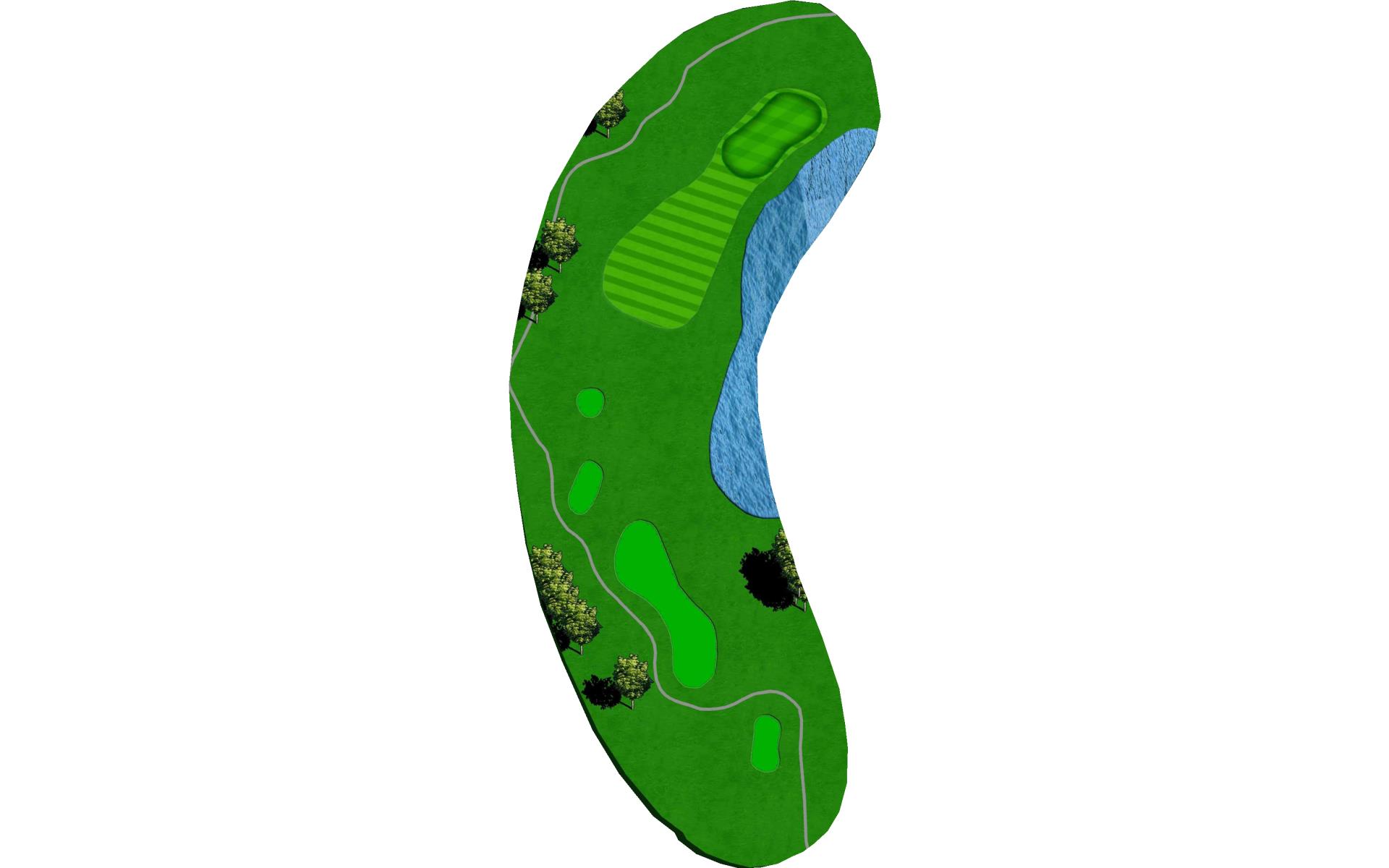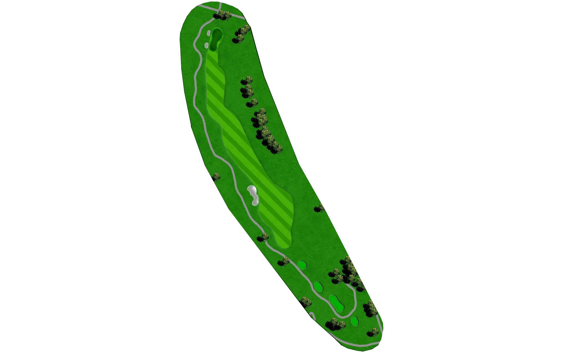 A medium length par 4 that dog legs slightly left. Tee shot should favor the right side of the fairway. A strong tee shot with some draw shape is ideal. The large tree on the left side of the hole will knock any tee shot too far left straight down into the rough. Favor the right side of the green with your approach shot. Any shot that lands left of the center of the green will release left quickly toward the creek. First bounce is typically firm, so play for some release.
