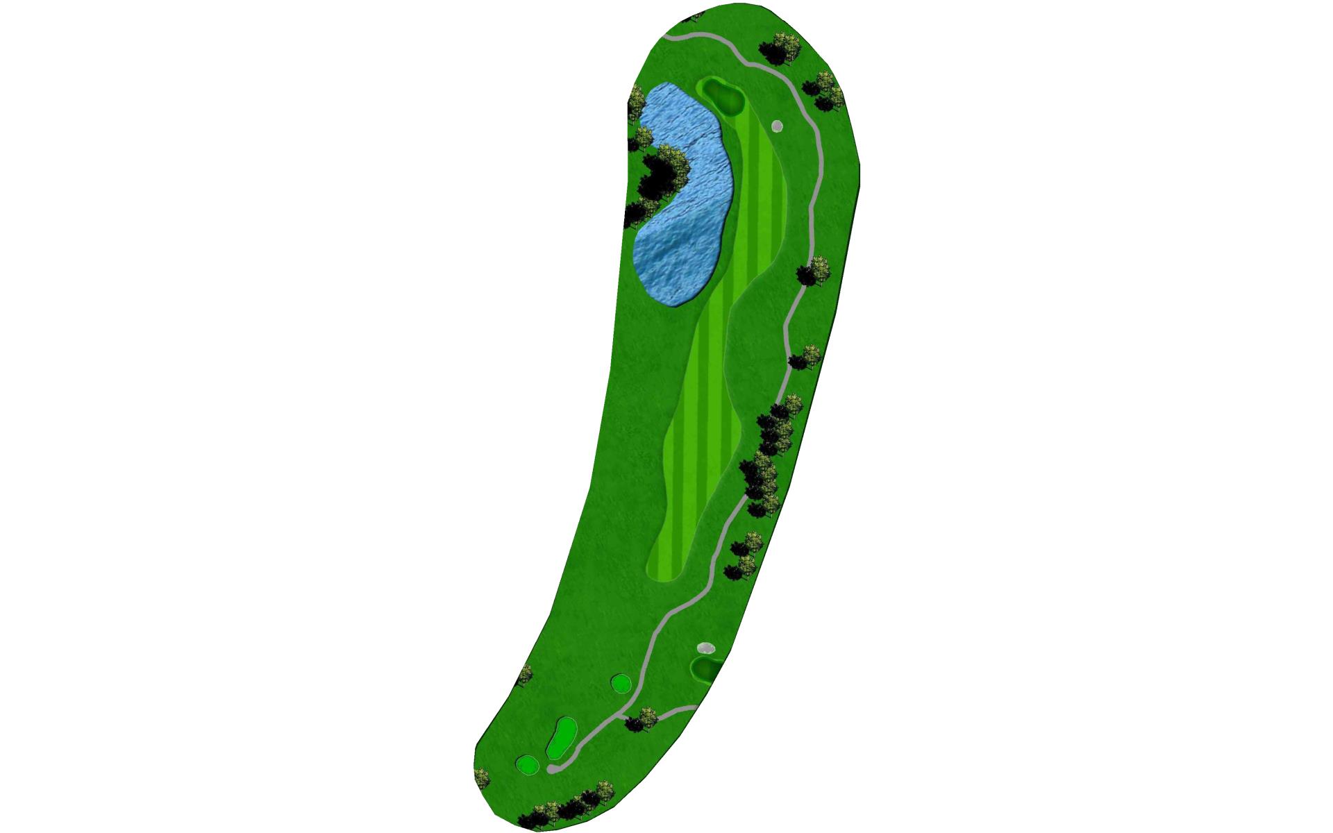 A strong par 3 with a pond in front and right of the green. The wind can be tricky on this hole as the green sits below a hill behind the green and an elevated tree line. Check the wind on the flags on the homes on the left side of the hole. The flag on the hole location typically doesn’t move even when there is wind above the green. The bailout is short and left. This will leave you a relatively straight forward, but fast pitch onto the green.