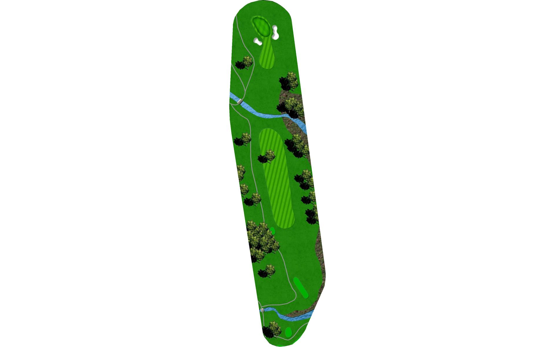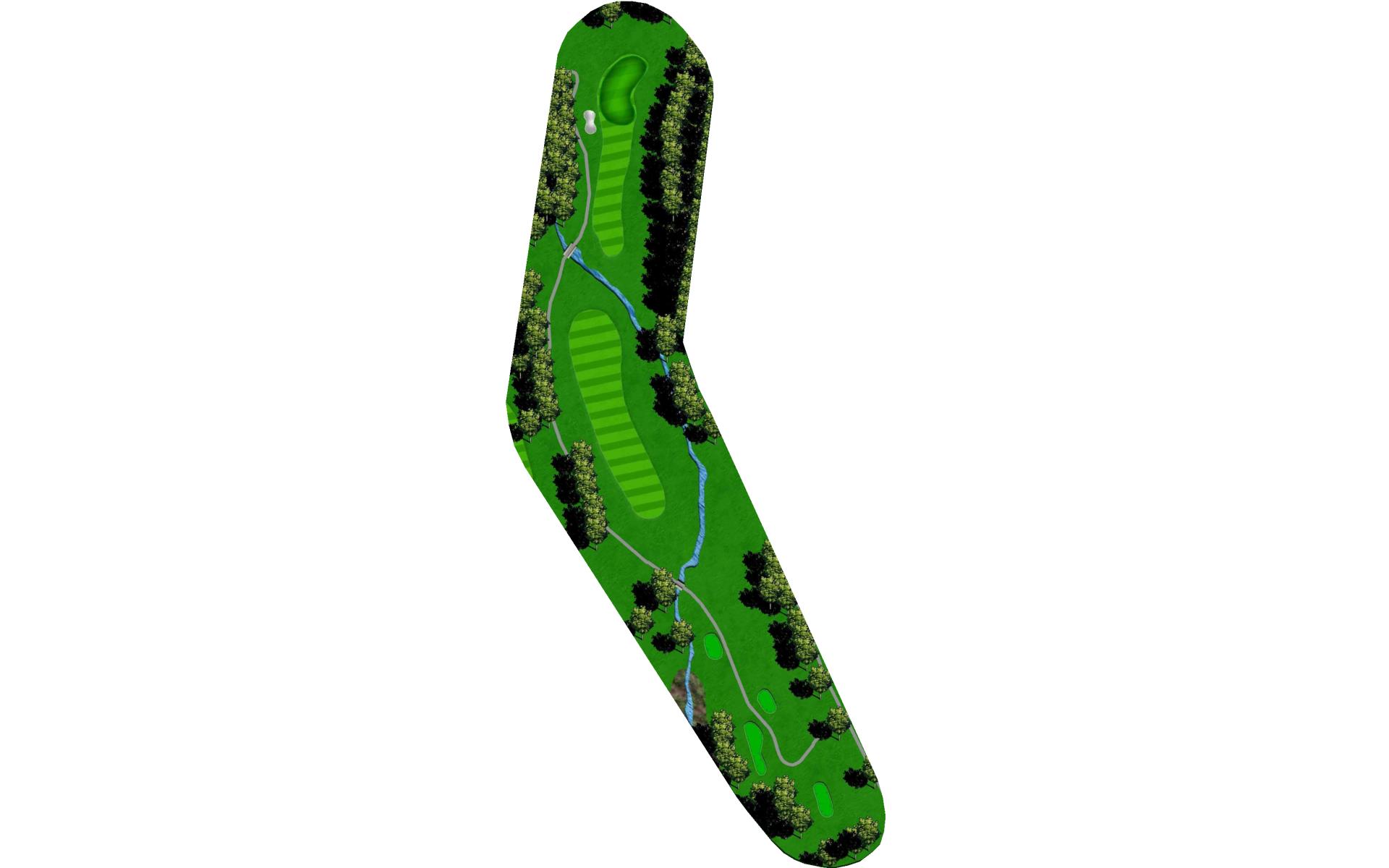 Both the tee shot and the second shot cross a winding creek. The two-tiered green makes the approach angle critical.