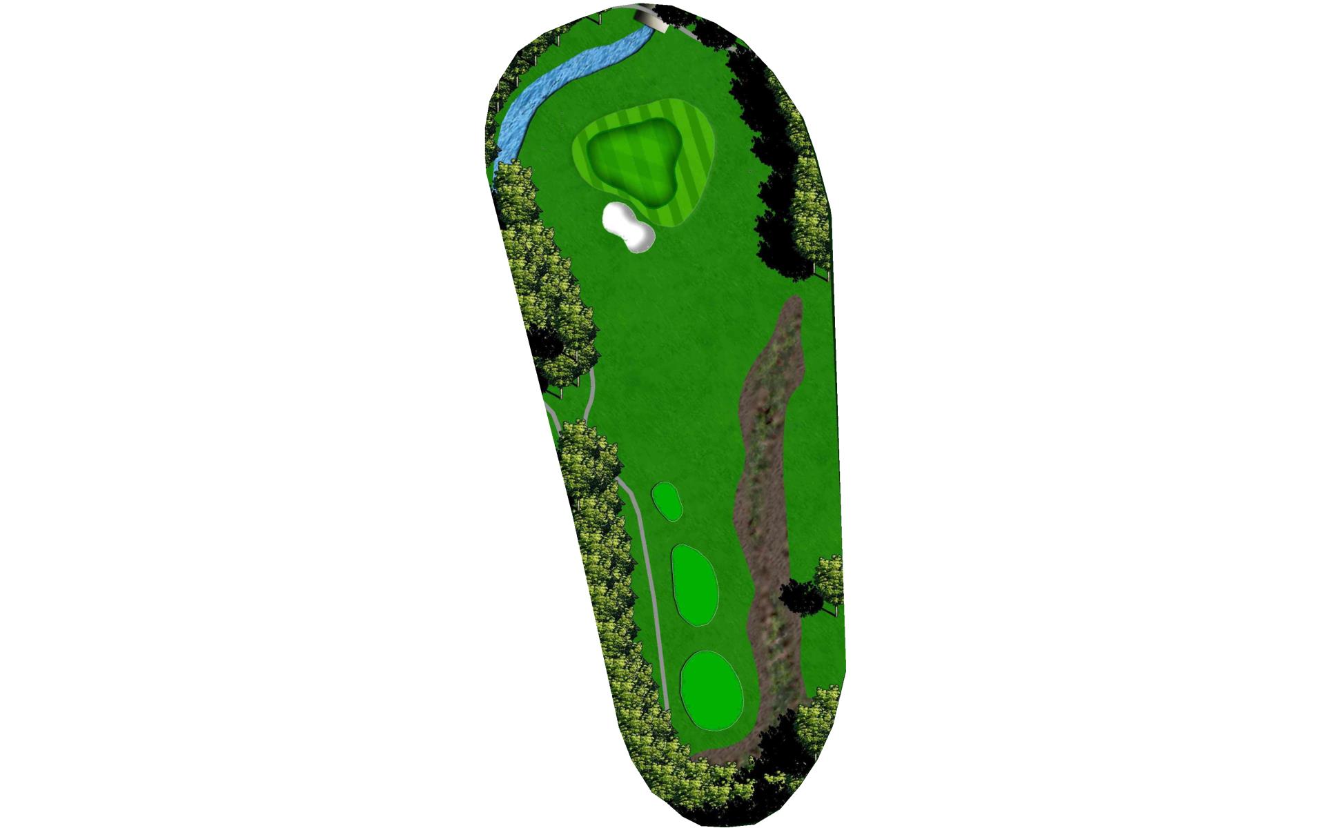 Dogleg left Par 4 that flows with a creek that runs up the middle of the hole. Play your drive with a driver or fairway wood out to the 150 stone. Favor the right side of the green as your approaches will bounce left. This is a good 3 club green so pay attention to the where the pin is for your best chance to par the hole.